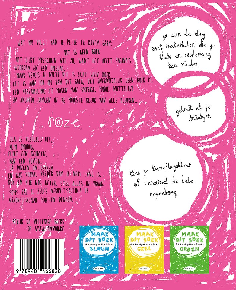 Maar vergis je niet! Dit is geen echt boek. Het is aan jou om van dit boek, dat overduidelijk geen boek is, een verzameling te maken van smerige, mooie, nutteloze en absurde dingen in de mooiste kleur van alle kleuren... Roze! Ga aan de slag met materialen die thuis en onderweg kunt vinden Gebruik al je zintuigen Kies je lievelingskleur of verzamel de hele regenboog