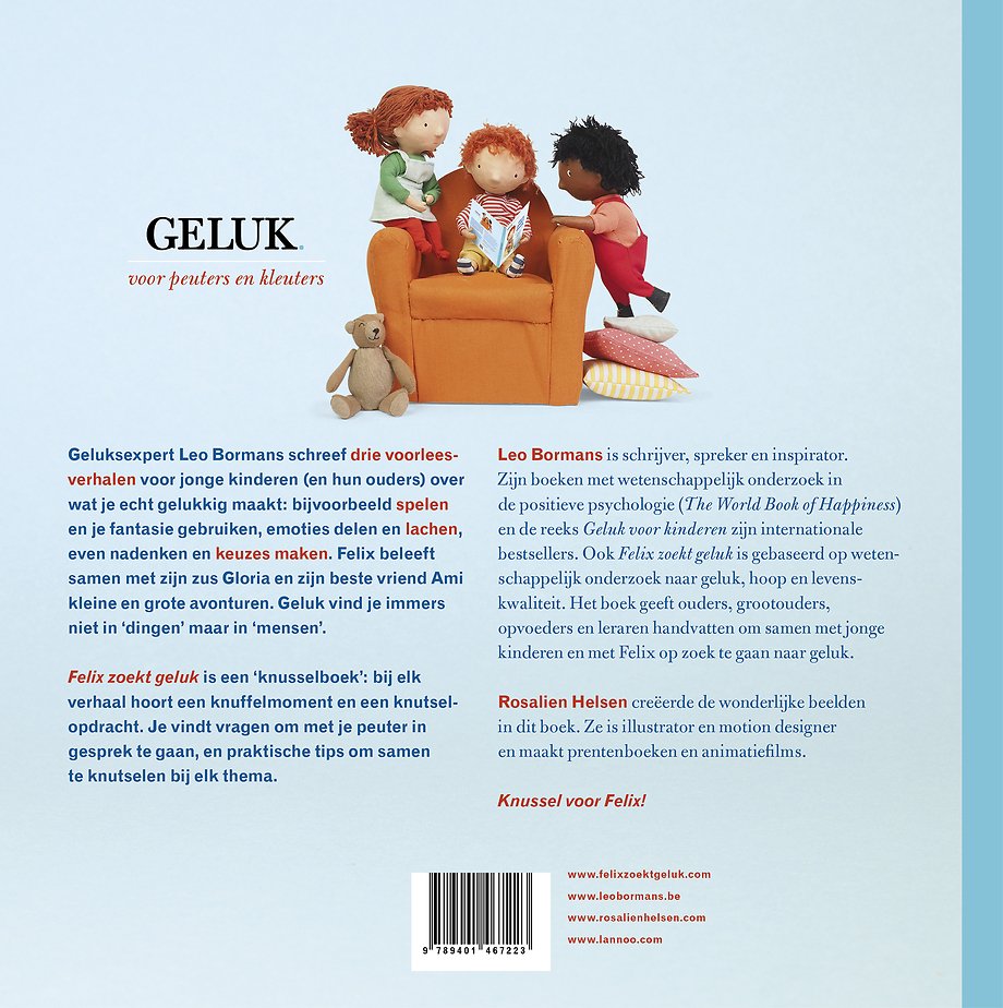 Geluksexpert Leo Bormans schreef drie voorleesverhalen voor jonge kinderen (en hun ouders) over wat je echt gelukkig maakt: bijvoorbeeld spelen en je fantasie gebruiken, emoties delen en lachen, even nadenken en keuzes maken. Felix beleeft samen met zijn zus Gloria en zijn beste vriend Ami kleine en grote avonturen. Geluk vind je immers niet in 'dingen' maar in 'mensen'.