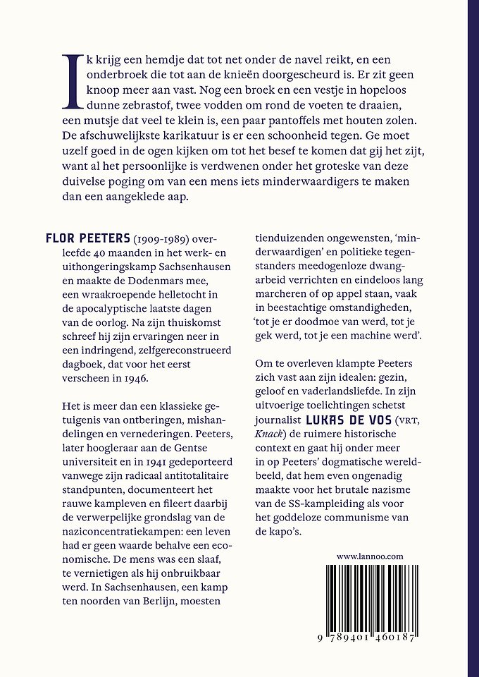 Flor Peeters (1909-1989) overleefde 40 maanden in het werk- en uithongeringskamp Sachsenhausen en maakte de Dodenmars mee, een wraakroepende helletocht in de apocalyptische laatste dagen van de oorlog. Na zijn thuiskomst schreef hij zijn ervaringen neer in een indringend, zelfgereconstrueerd dagboek, dat voor het eerst verscheen in 1946.