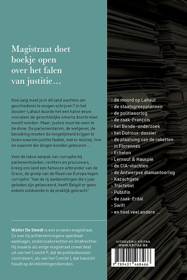 De parlementairen, de wetgever, de bevolking moeten de mogelijkheid krijgen te lezen waarom justitie faalde, wat er misliep, hoe en waarom die dingen konden gebeuren: de moord op Lahaut / de staatsgreepplannen / de politieoorlog / de zaak-François / het Bende-onderzoek / het Dutroux-dossier / de plaatsing van de raketten in Florennes / Echelon / Lernaut & Hauspie / de CIA-vluchten / de Antwerpse diamantoorlog / Kazachgate / Tractebel / Publifin / de zaak-Erdal / het dossier-Raes / Swift / en heel veel andere ...