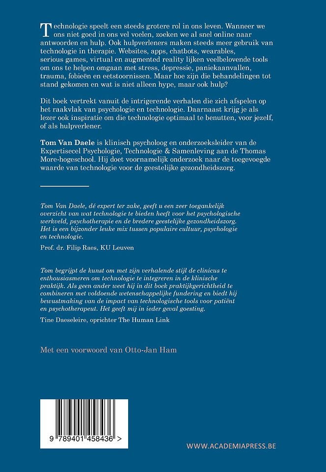 Technologie speelt een steeds grotere rol in ons leven. Wanneer we ons niet goed in ons vel voelen, zoeken we al snel online naar antwoorden en hulp. Ook hulpverleners maken steeds meer gebruik van technologie in therapie. Websites, apps, chatbots, wearables, serious games, virtual en augmented reality lijken veelbelovende tools om ons te helpen omgaan met stress, depressie, paniekaanvallen, trauma, fobieën en eetstoornissen. Maar hoe zijn die behandelingen tot stand gekomen en wat is niet alleen hype, maar ook hulp?