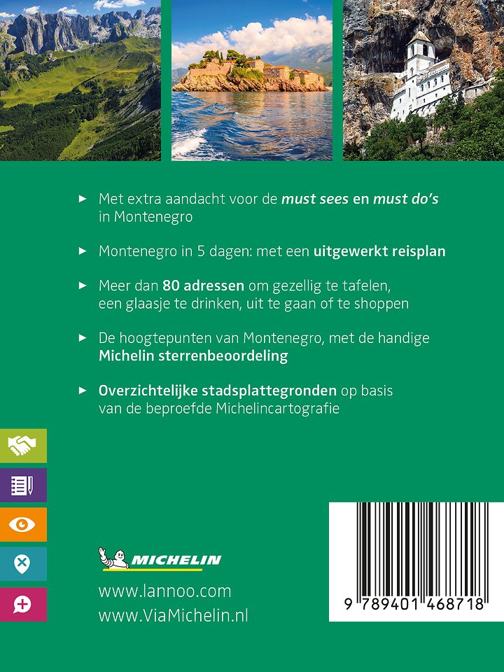 Met extra aandacht voor de must sees en must do's in Montenegro Montenegro in 5 dagen: met een uitgewerkt reisplan Meer dan 80 adressen om gezellig te tafelen, een glaasje te drinken, uit te gaan of te shoppen De hoogtepunten van Montenegro, met de handige Michelin sterrenbeoordeling Overzichtelijke stadsplattegronden op basis van de beproefde Michelincartografie