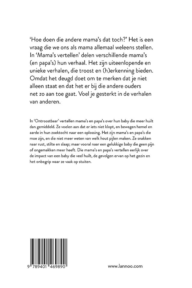 In 'Ontroostbaar' vertellen mama's en papa's over hun baby die meer huilt dan gemiddeld. Ze voelen aan dat er iets niet klopt, en bewegen hemel en aarde in hun zoektocht naar een oplossing. Het zijn mama's en papa's die moe zijn, en die niet meer weten van welk hout pijlen maken. Ze snakken naar rust, stilte en slaap; maar vooral naar een gelukkige baby die geen pijn of ongemakken meer heeft. Die mama's en papa's vertellen eerlijk over de impact van een baby die veel huilt, de gevolgen ervan op het gezin en het onbegrip waar ze vaak op stuiten.