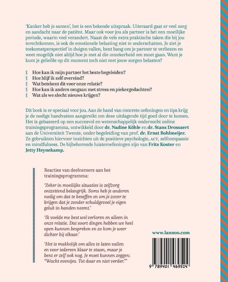 'Kanker heb je samen', het is een bekende uitspraak. Uiteraard gaat er veel zorg en aandacht naar de patiënt. Maar ook voor jou als partner is het een moeilijke periode, waarin veel verandert. Naast de vele extra praktische taken die bij jou terechtkomen, is ook de emotionele belasting niet te onderschatten. Je ziet je toekomstperspectief in duigen vallen, bent bang om je partner te verliezen en weet mogelijk niet altijd hoe je met al die onzekerheid om moet gaan. Want je kunt je geliefde op dit moment toch niet met jouw zorgen belasten? Hoe kan ik mijn partner het beste begeleiden? Hoe blijf ik zelf overeind? Wat betekent dit voor onze relatie? Hoe kan ik anders omgaan met stress en piekergedachten? Wat als we slecht nieuws krijgen?