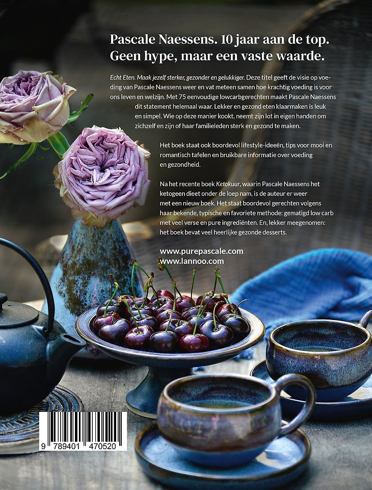 Echt Eten. Maak jezelf sterker, gezonder en gelukkiger. Deze titel geeft de visie op voeding van Pascale Naessens weer en vat meteen samen hoe krachtig voeding is voor ons leven en welzijn. Met 75 eenvoudige lowcarbgerechten maakt Pascale Naessens dit statement helemaal waar. Lekker en gezond eten klaarmaken is leuk en simpel. Wie op deze manier kookt, neemt zijn lot in eigen handen om zichzelf en zijn of haar familieleden sterk en gezond te maken.