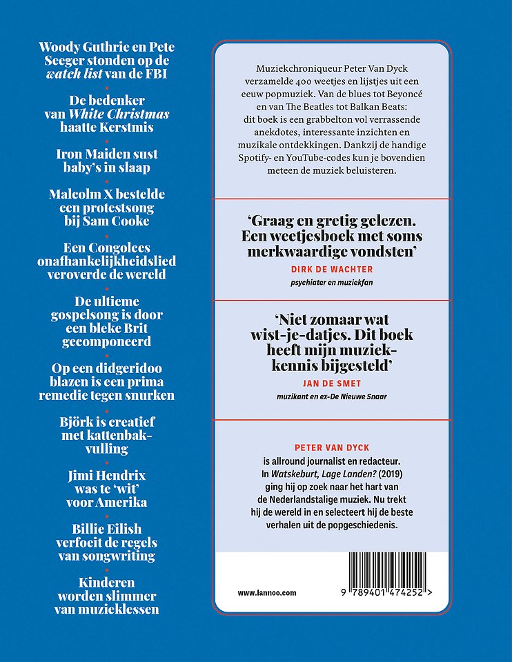 Muziekchroniqueur Peter Van Dyck verzamelde 400 weetjes en lijstjes uit een eeuw popmuziek. Van de blues tot Beyoncé en van The Beatles tot Balkan Beats: dit boek is een grabbelton vol verrassende anekdotes, interessante inzichten en muzikale ontdekkingen. Dankzij de handige Spotify- en YouTube-codes kun je bovendien meteen de muziek beluisteren.