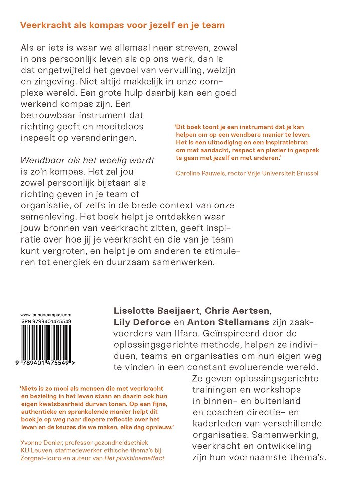 Wendbaar als het woelig wordt is zo'n kompas. Het zal jou zowel persoonlijk bijstaan als richting geven in je team of organisatie, of zelfs in de brede context van onze samenleving. Het boek helpt je ontdekken waar jouw bronnen van veerkracht zitten, geeft inspiratie over hoe jij je veerkracht en die van je team kunt vergroten, en helpt je om anderen te stimuleren tot energiek en duurzaam samenwerken.