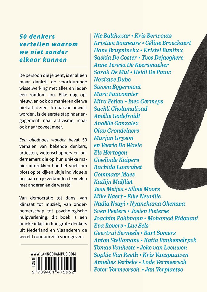 Een alledaags wonder bevat 50 verhalen van bekende denkers, artiesten, wetenschappers en ondernemers die op hun unieke manier uitdrukken hoe het voelt om plots op te kijken uit je individuele bestaan en je verbonden te voelen met anderen en de wereld.