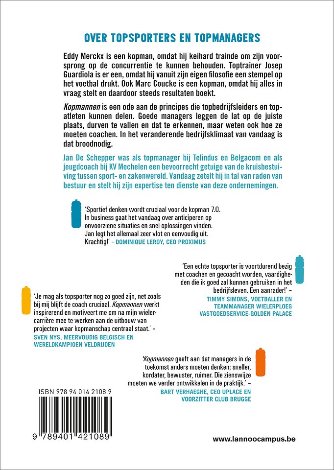 Eddy Merckx is een kopman, omdat hij keihard trainde om zijn voorsprong op de concurrentie te kunnen behouden. Toptrainer Josep Guardiola is er een, omdat hij vanuit zijn eigen filosofie een stempel op het voetbal drukt. Ook Marc Coucke is een kopman, omdat hij alles in vraag stelt en daardoor steeds resultaten boekt.