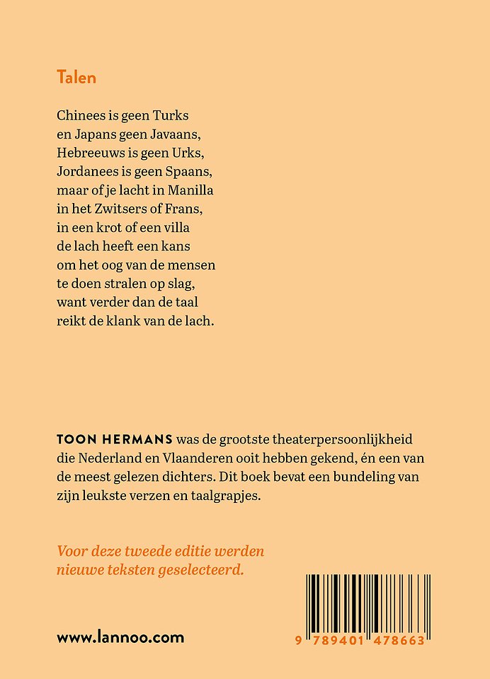 TOON HERMANS was de grootste theaterpersoonlijkheid die Nederland en Vlaanderen ooit hebben gekend, én een van de meest gelezen dichters. Dit boek bevat een bundeling van zijn leukste verzen en taalgrapjes.