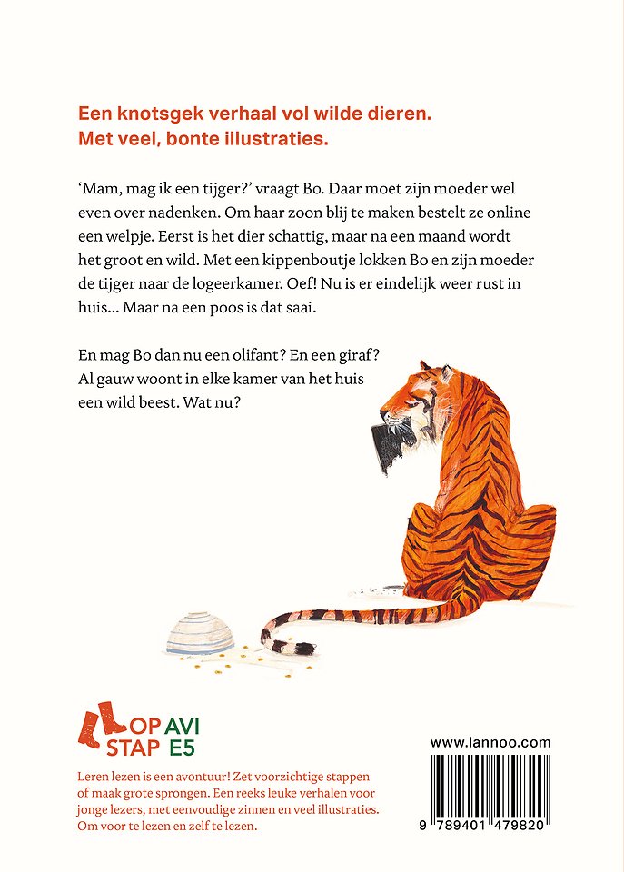 'Mam, mag ik een tijger?' vraagt Bo. Daar moet zijn moeder wel even over nadenken. Om haar zoon blij te maken bestelt ze online een welpje. Eerst is het dier schattig, maar na een maand wordt het groot en wild. Met een kippenboutje lokken Bo en zijn moeder de tijger naar de logeerkamer. Oef! Nu is er eindelijk weer rust in huis. Maar na een poos is dat saai.