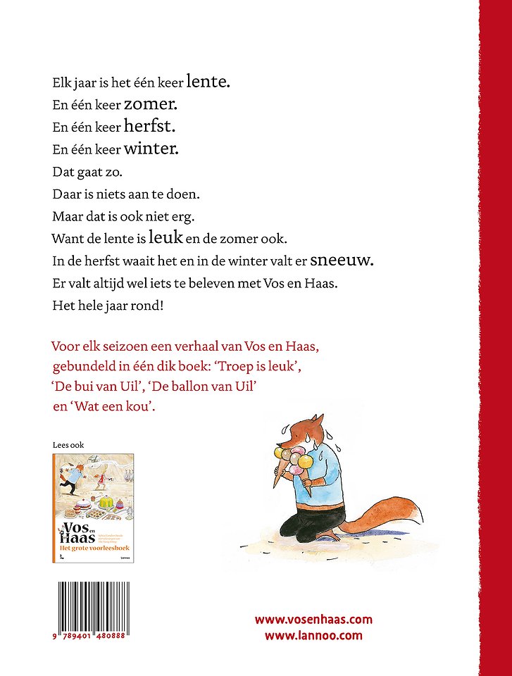 Voor elk seizoen een verhaal van Vos en Haas, gebundeld in één dik boek: Troep is leuk, De bui van Uil, De ballon van Uil en Wat een kou.