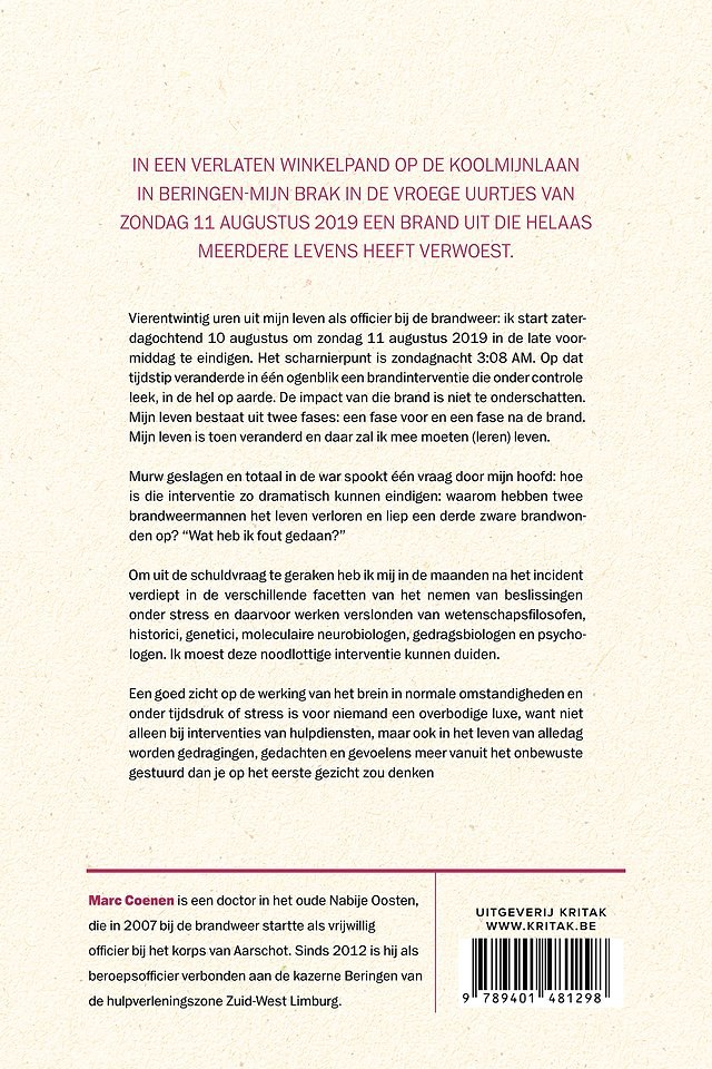 Vierentwintig uren uit mijn leven als officier bij de brandweer: ik start zaterdagochtend 10 augustus om zondag 11 augustus 2019 in de late voormiddag te eindigen. Het scharnierpunt is zondagnacht 3:08 AM. Op dat tijdstip veranderde in één ogenblik een brandinterventie die onder controle leek, in de hel op aarde. De impact van die brand is niet te onderschatten. Mijn leven bestaat uit twee fases: een fase voor en een fase na de brand. Mijn leven is toen veranderd en daar zal ik mee moeten (leren) leven.
