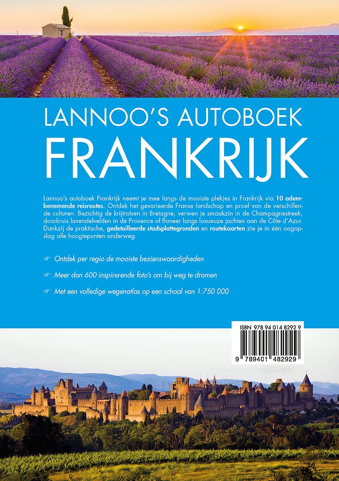 Lannoo's autoboek Frankrijk neemt je mee langs de mooiste plekjes in Frankrijk via 10 adembenemende reisroutes. Ontdek het gevarieerde Franse landschap en proef van de verschillende culturen. Bezichtig de krijtrotsen in Bretagne, verwen je smaakzin in de Champagnestreek, doorkruis lavendelvelden in de Provence of flaneer langs luxueuze jachten aan de Côte d'Azur. Dankzij de praktische, gedetailleerde stadsplattegronden en routekaarten zie je in één oogopslag alle hoogtepunten onderweg. Ontdek per regio de mooiste bezienswaardigheden Meer dan 600 inspirerende foto's om bij weg te dromen Met een volledige wegenatlas op een schaal van 1:750 000