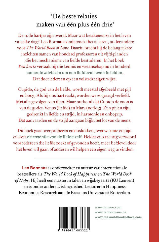De rode hartjes zijn overal. Maar wat betekenen ze in het leven van elke dag? Leo Bormans onderzoekt het al jaren, onder andere voor The World Book of Love. Daarin bracht hij de belangrijkste inzichten samen van honderd professoren uit vijftig landen die het mechanisme van liefde bestuderen. In het boek Van harte vertaalt hij die kennis en wetenschap nu in honderd concrete adviezen om een liefdevol leven te leiden. Dat doet iedereen op een volstrekt eigen wijze.