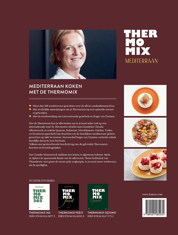 Met de Thermomix kun je alle kanten op en je kunt zeker ook op een internationale tour! In Thermomix Mediterraan bundelen Claudia Allemeersch en enkele Spaanse, Italiaanse, Marokkaanse, Griekse, Turkse en Kroatische gastchefs hun krachten om de heerlijkste mediterraan getinte gerechten op tafel te toveren. Sterrenchef Roger van Damme creëerde enkele heerlijke desserts voor het boek.