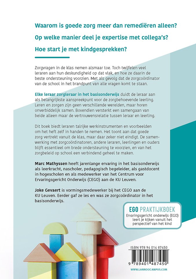 Dit boek biedt leraren talrijke werkinstrumenten en voorbeelden om het heft zelf in handen te nemen. Het toont aan dat goede zorg vertrekt vanuit de klas, maar daar zeker niet eindigt. De samenwerking met zorgcoördinatoren, andere leraren, leerlingen en ouders blijft essentieel om brede ondersteuning te voorzien, en van het zorgbeleid op school een verbindend geheel te maken.