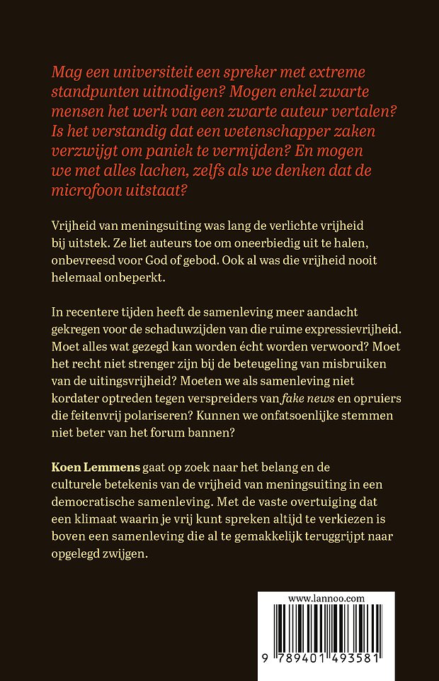 Koen Lemmens gaat op zoek naar het belang en de culturele betekenis van de vrijheid van meningsuiting in een democratische samenleving. Met de vaste overtuiging dat een klimaat waarin je vrij kunt spreken altijd te verkiezen is boven een samenleving die al te gemakkelijk teruggrijpt naar opgelegd zwijgen.