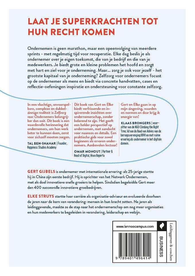Ondernemen is geen marathon, maar een opeenvolging van meerdere sprints – met regelmatig tijd voor recuperatie. Elke dag beslis je als ondernemer over je eigen toekomst, die van je bedrijf en die van je medewerkers. Je biedt grote en kleine problemen het hoofd en zorgt met hart en ziel voor je onderneming. Maar... zorg je ook voor jezelf – het grootste kapitaal van je onderneming? Zelfzorg voor ondernemers focust op de ondernemer als mens en biedt via concrete handvatten, cases en reflectie-oefeningen inspiratie en ondersteuning voor constante zelfzorg.