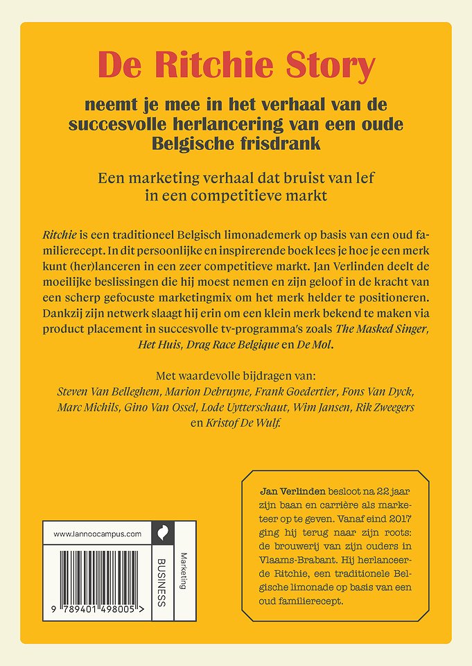 Ritchie is een traditioneel Belgisch limonademerk op basis van een oud familierecept. In dit persoonlijke en inspirerende boek lees je hoe je een merk kunt (her)lanceren in een zeer competitieve markt. Jan Verlinden deelt de moeilijke beslissingen die hij moest nemen en zijn geloof in de kracht van een scherp gefocuste marketingmix om het merk helder te positioneren. Dankzij zijn netwerk slaagt hij erin om een klein merk bekend te maken via product placement in succesvolle tv-programma's zoals The Masked Singer, Het Huis, Drag Race Belgique en De Mol.