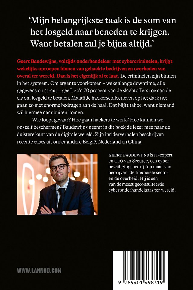 Meer over Geert BaudewijnsGeert Baudewijns is voltijds onderhandelaar met cybercriminelen. Wekelijks krijgt hij oproepen binnen van gehackte bedrijven en overheden van overal ter wereld. Dan is het eigenlijk al te laat. De criminelen zijn binnen in het systeem. Om erger te voorkomen - wekenlange downtime, alle gegevens op straat - geeft zo'n 70 procent van de slachtoffers toe aan de eis om losgeld te betalen. Malafide hackerscollectieven op het dark net gaan zo met enorme bedragen aan de haal. Dat blijft taboe, want niemand wil hiermee naar buiten komen.