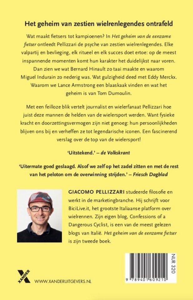 Wat maakt fi etsers tot kampioenen? In Het geheim van de eenzame fietser ontleedt Pellizzari de psyche van zestien wielrenlegendes. Elke valpartij en bevlieging, elk ritueel en elk succes doet ertoe: op de meest inspannende momenten komt hun karakter het duidelijkst naar voren. Dan zien we wat Bernard Hinault zo taai maakte en waarom Miguel Indurain zo nederig was. Wat gulzigheid deed met Eddy Merckx. Waarom we Lance Armstrong een blaaskaak vinden en wat het geheim is van Tom Dumoulin.