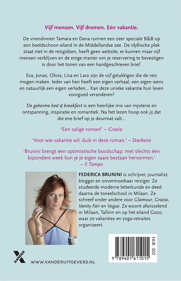 In de heerlijke roman De geheime bed & breakfast van Federica Brunini runnen de vriendinnen Tamara en Dana een zeer speciale B&B op een beeldschoon eiland in de Middellandse zee. De idyllische plek staat niet in de reisgidsen, heeft geen website, er kunnen maar vijf mensen verblijven en de enige manier om je reservering te bevestigen is door het tonen van een handgeschreven brief.