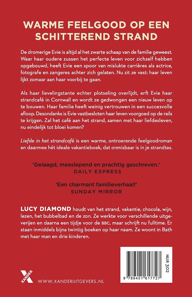 In de grappige en warme roman Liefde in het strandcafé van de Engelse bestsellerauteur Lucy Diamond is de dromerige Evie altijd al het zwarte schaap van de familie geweest. Waar haar oudere zussen het perfecte leven voor zichzelf hebben opgebouwd, heeft Evie een spoor van mislukte carrières als actrice, fotografe en zangeres achter zich gelaten. Nu zit ze vast: haar leven lijkt zomaar aan haar voorbij te gaan.