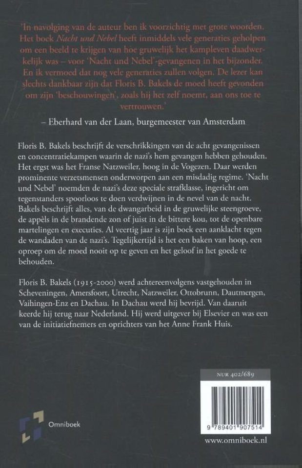 Nacht und Nebel was een speciale strafklasse die tijdens de Tweede Wereldoorlog werd ingesteld om verzetsmensen spoorloos te doen verdwijnen. Achterblijvers vernamen niets meer over hun lot. Een van de kampen waar deze gevangenen terechtkwamen was Natzweiler, een kamp op een hoge berg in Frankrijk. Floris B. Bakels (1915-2000) heeft daar bijna drie volle jaren een dagboek bijgehouden, dat als basis heeft gediend voor zijn boek Nacht und Nebel.