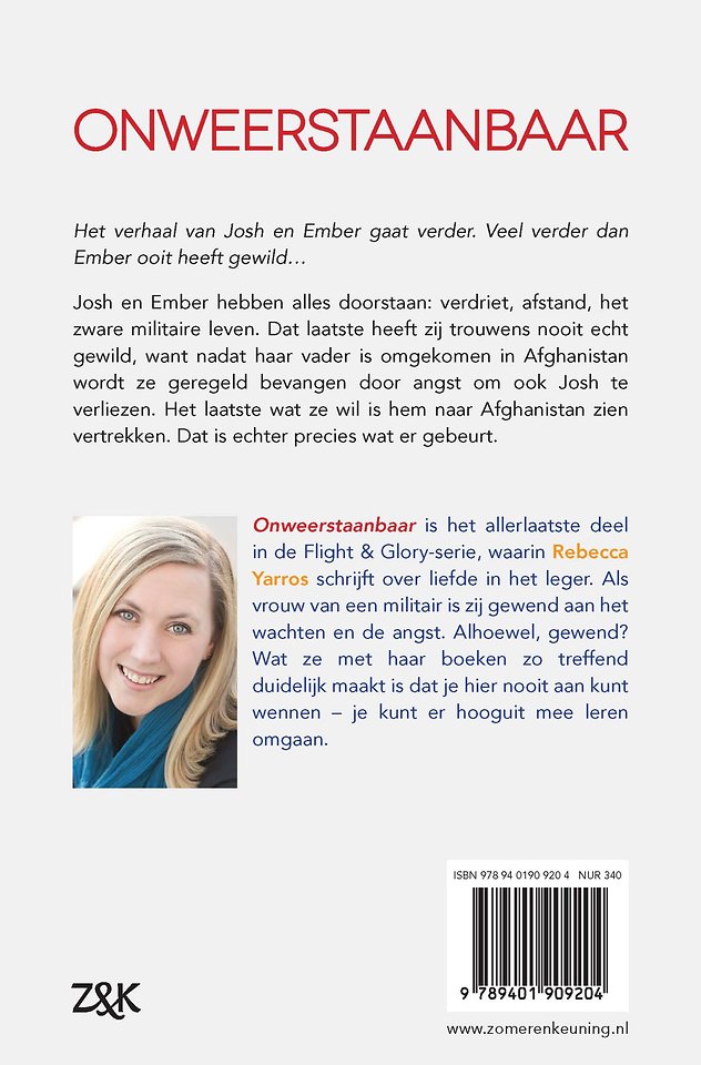 'Onweerstaanbaar' van Rebecca Yarros is het vierde deel in de serie 'Flight & Glory'. Dit boek heeft dezelfde hoofdpersonen uit het eerste deel, 'Onverminderd'. Josh en Ember hebben samen veel doorstaan: afstand, verdriet, het zware militaire leven. Dat alles heeft Ember nooit echt gewild, want nadat haar vader is omgekomen in Afghanistan heeft zich een angst in haar genesteld die er met geen stok valt uit te slaan. Het laatste wat ze dan ook wil is Josh naar Afghanistan vertrekken, en dat is precies wat er in 'Onweerstaanbaar' gebeurt. Rebecca Yarros weet als vrouw van een militair als geen ander hoe dat is en beschrijft het prachtig invoelend. Eerder verschenen in de Flight & Glory-serie 'Onverminderd', 'Onbereikbaar' en 'Onverwacht'.