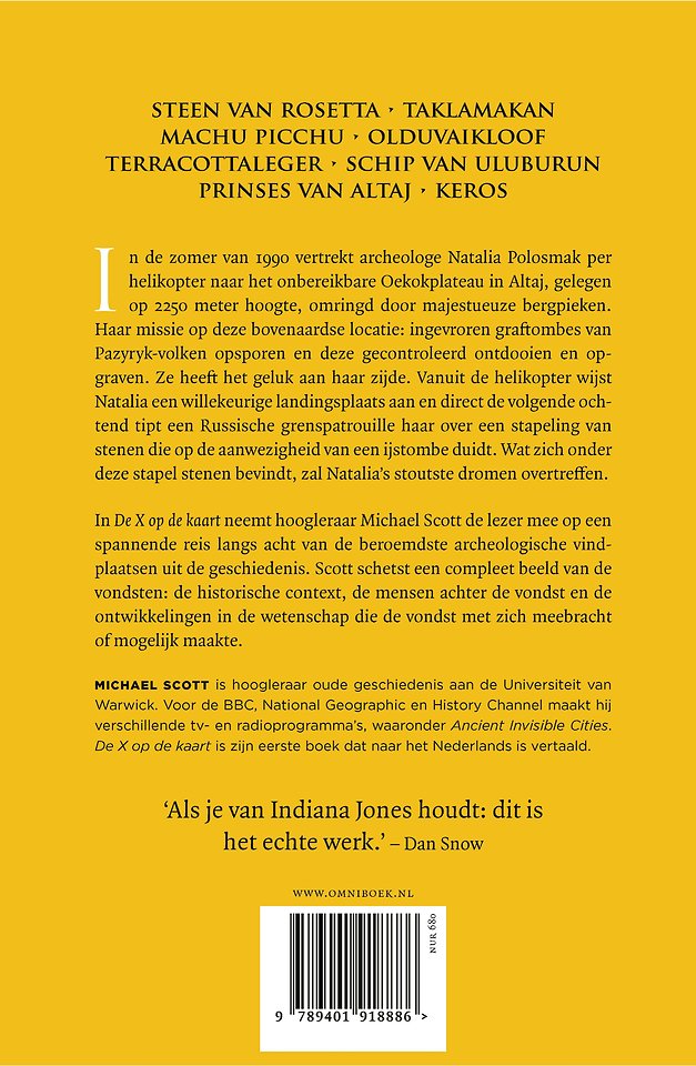 In ‘De X op de kaart’ laat Michael Scott, hoogleraar oude geschiedenis aan de Universiteit van Warwick, de lezer kennismaken met de avontuurlijke wereld van de archeologie. Aan de hand van acht roemruchte vindplaatsen neemt hij de lezer mee op een spannende reis door de geschiedenis van deze fascinerende discipline. ‘De X op de kaart’ introduceert niet alleen de pioniers uit het verleden, maar ook de hoogtechnologische ontwikkelingen in het vak vandaag de dag. Scott vertelt wie de mensen waren achter grote vondsten als de steen van Rosetta, het terracottaleger, Machu Picchu en andere overblijfselen van verloren beschavingen. Steeds weer blijkt dat de vondsten uit het verleden ons iets vertellen over dilemma’s waar we nu mee worstelen.