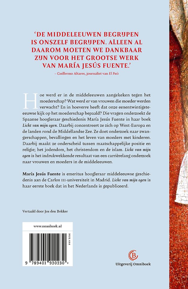 Hoe werd er in de middeleeuwen aangekeken tegen het moederschap? Wat werd er van vrouwen die moeder werden verwacht? En in hoeverre bepaalt dat onze eenentwintigste-eeuwse kijk op het moederschap? Die vragen onderzoekt de Spaanse hoogleraar geschiedenis María Jesús Fuente in haar boek ‘Licht van mijn ogen’. Ze concentreert zich op West-Europa en de landen rond de Middellandse Zee. Ze doet onderzoek naar zwangerschappen, bevallingen en het leven van moeders met kinderen. Daarbij maakt ze onderscheid tussen maatschappelijke positie en religie; het jodendom, het christendom en de islam. ‘Licht van mijn ogen’ is het indrukwekkende resultaat van een carrièrelang onderzoek naar vrouwen en moeders in de middeleeuwen.