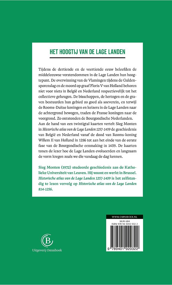 In ‘Historische atlas van de Lage Landen 1257-1439’ beschrijft Sieg Monten de geschiedenis van België en Nederland aan de hand van twintig historische kaarten. Hij begint met de dood van Rooms-koning Willem II in 1256 en eindigt in 1439, wanneer de eerste fase van de Bourgondische eenmaking afgerond is. De kaarten tonen de politieke en militaire geschiedenis van het gebied dat nu België en Nederland is. Elke kaart overspant de regeerperiode van een Rooms-Duitse vorst. Op (een deel van) het graafschap Vlaanderen na vertegenwoordigde hij in de Lage Landen tussen de dertiende en de vijftiende eeuw het centrale gezag. De kaarten tonen de lezer hoe de Lage Landen evolueren en kaart voor kaart de vorm krijgen zoals we die vandaag de dag kennen.