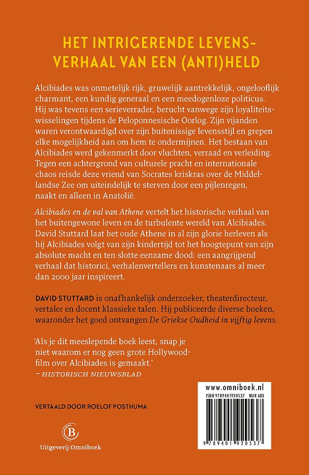 ‘Alcibiades en de val van Athene’ van classicus David Stuttard is de historische biografie van de Griekse (anti-)held Alcibiades. Hij werd rond 450 v.Chr. geboren in Athene. Alcibiades, ooit een volgeling en goede vriend van Socrates, was onmetelijk rijk, gruwelijk aantrekkelijk, ongelooflijk charmant, een kundige generaal en een meedogenloze politicus. Hij was tevens een beruchte serieverrader, die tijdens de Peloponnesische Oorlog overliep naar Sparta en vervolgens naar de Perzen. David Stuttard laat het oude Athene in al zijn glorie herleven als hij Alcibiades volgt van zijn kindertijd tot het hoogtepunt van zijn absolute macht, tegen een achtergrond van culturele pracht en internationale chaos.