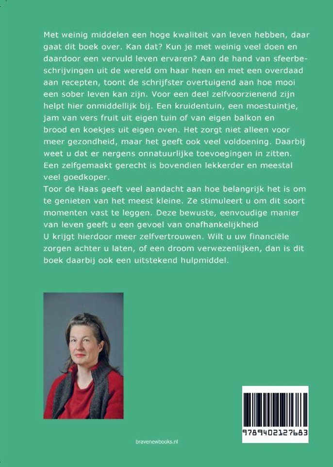 Met weinig middelen een hoge kwaliteit van leven hebben, daar gaat dit boek over. Kan dat? Kun je met weinig veel doen en daardoor een vervuld leven ervaren? Aan de hand van sfeerbeschrijvingen uit de wereld om haar heen en met een overdaad aan recepten, toont de schrijfster overtuigend aan hoe mooi een sober leven kan zijn. Voor een deel zelfvoorzienend zijn helpt hier bij. Een kruidentuin, een moestuintje, jam van vers fruit uit eigen tuin of van eigen balkon en brood en koekjes uit eigen oven. Het zorgt niet alleen voor meer gezondheid, maar het geeft ook veel voldoening. Een zelfgemaakt gerecht is bovendien lekkerder! Er zit dan ook geen enkele onnatuurlijke toevoeging in.