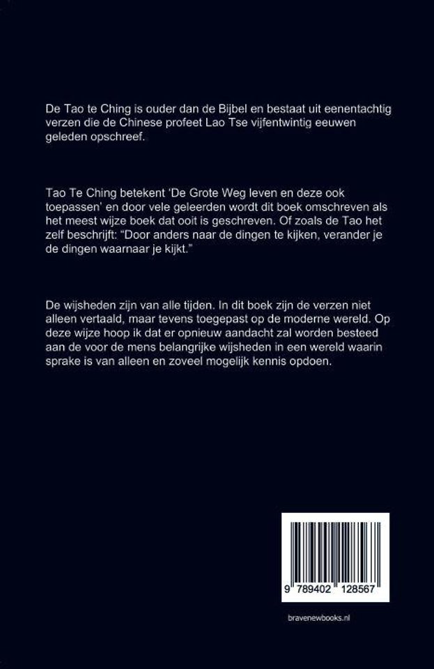 Tao Te Ching betekent 'De Grote Weg leven en deze ook toepassen' en door vele geleerden wordt dit boek omschreven als het meest wijze boek dat ooit is geschreven. Of zoals de Tao het zelf beschrijft: "Door anders naar de dingen te kijken, verander je de dingen waarnaar je kijkt."