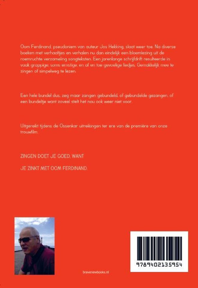 Oom Ferdinand, pseudoniem van auteur Jos Hekking, slaat weer toe. Na diverse boeken met verhaaltjes en verhalen nu dan eindelijk een bloemlezing uit de roemruchte verzameling songteksten. Een jarenlange schrijfdrift resulteerde in vaak grappige, soms ernstige, en af en toe gevoelige liedjes. Gemakkelijk mee te zingen of simpelweg te lezen.