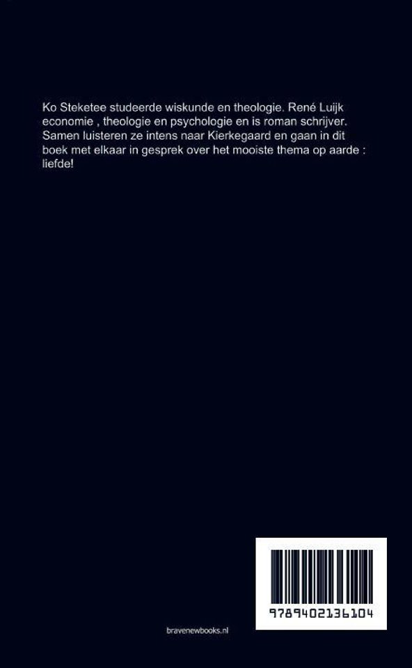 Ko Steketee studeerde wiskunde en theologie. René Luijk economie , theologie en psychologie en is roman schrijver. Samen luisteren ze intens naar Kierkegaard en gaan in dit boek met elkaar in gesprek over het mooiste thema op aarde : liefde!
