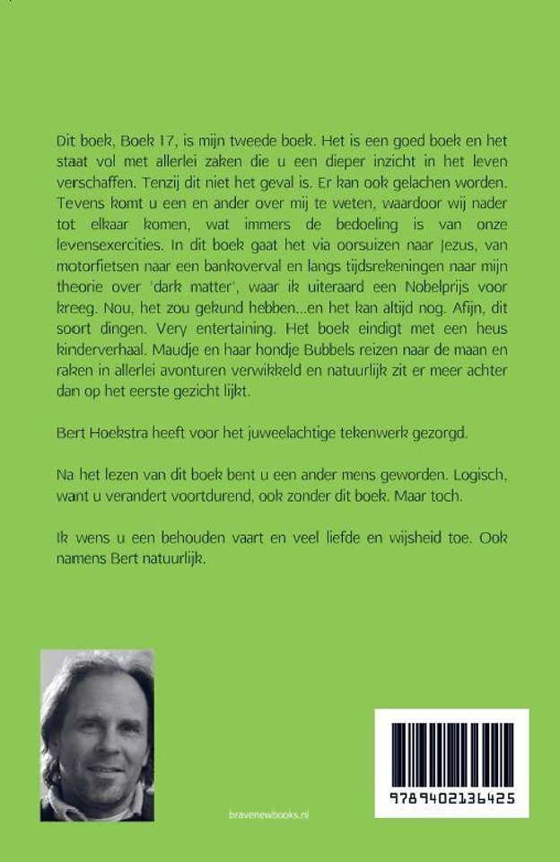 Dit boek, Boek 17, is mijn tweede boek. Het is een goed boek en het staat vol met allerlei zaken die u een dieper inzicht in het leven verschaffen. Tenzij dit niet het geval is. Er kan ook gelachen worden. Tevens komt u een en ander over mij te weten, waardoor wij nader tot elkaar komen, wat immers de bedoeling is van onze levensexercities. In dit boek gaat het via oorsuizen naar Jezus, van motorfietsen naar een bankoverval en langs tijdsrekeningen naar mijn theorie over 'dark matter', waar ik uiteraard een Nobelprijs voor kreeg. Nou, het zou gekund hebben...en het kan altijd nog. Afijn, dit soort dingen. Very entertaining. Het boek eindigt met een heus kinderverhaal. Maudje en haar hondje Bubbels reizen naar de maan en raken in allerlei avonturen verwikkeld en natuurlijk zit er meer achter dan op het eerste gezicht lijkt.