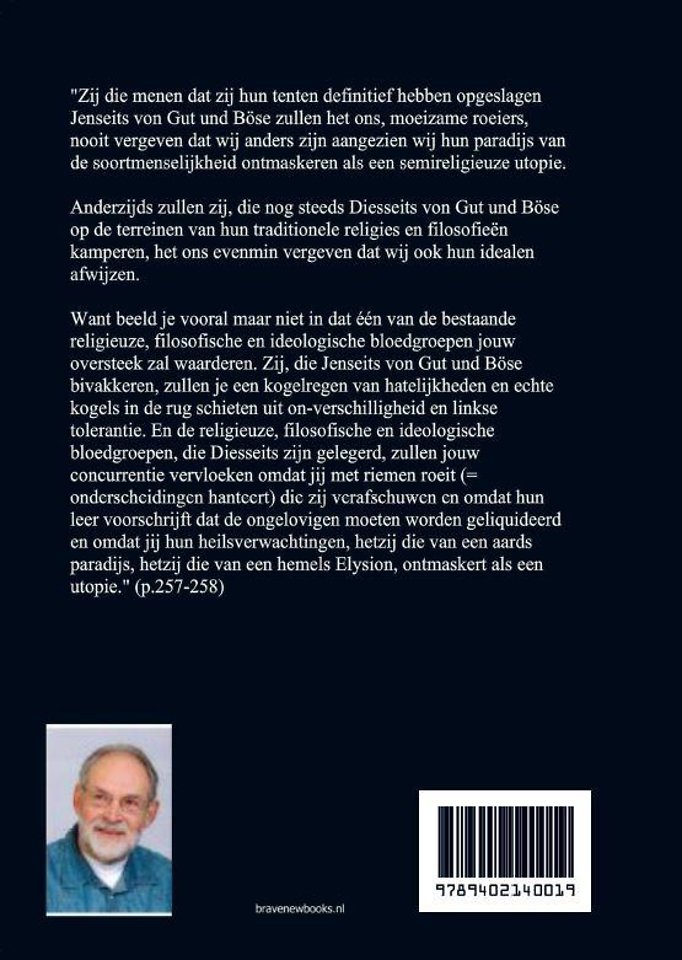 Want beeld je vooral maar niet in dat één van de bestaande religieuze, filosofische en ideologische bloedgroepen jouw oversteek zal waarderen. Zij, die Jenseits von Gut und Böse bivakkeren, zullen je een kogelregen van hatelijkheden en echte kogels in de rug schieten uit on-verschilligheid en linkse tolerantie. En de religieuze, filosofische en ideologische bloedgroepen, die Diesseits zijn gelegerd, zullen jouw concurrentie vervloeken omdat jij met riemen roeit (= onderscheidingen hanteert) die zij verafschuwen en omdat hun leer voorschrijft dat de ongelovigen moeten worden geliquideerd en omdat jij hun heilsverwachtingen, hetzij die van een aards paradijs, hetzij die van een hemels Elysion, ontmaskert als een utopie." (p.258-259)