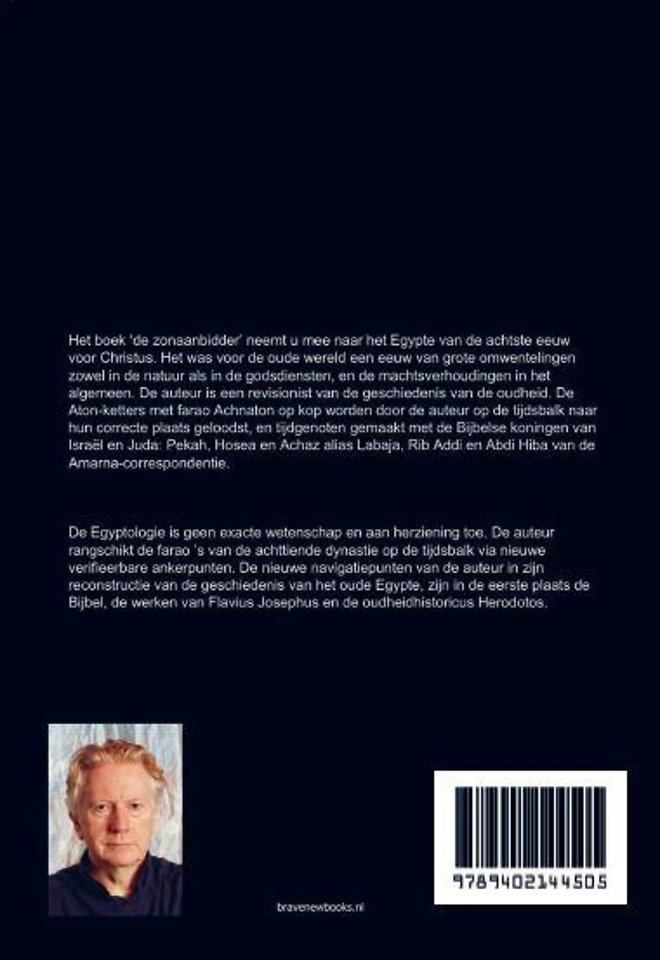 Het boek ‘de zonaanbidder’ neemt u mee naar het Egypte van de achtste eeuw voor Christus. Het was voor de oude wereld een eeuw van grote omwentelingen zowel in de natuur als in de godsdiensten, en de machtsverhoudingen in het algemeen. De auteur is een revisionist van de geschiedenis van de oudheid. De Aton-ketters met farao Achnaton op kop worden door de auteur op de tijdsbalk naar hun correcte plaats geloodst, en tijdgenoten gemaakt met de Bijbelse koningen van Israël en Juda: Pekah, Hosea en Achaz alias Labaja, Rib Addi en Abdi Hiba van de Amarna-correspondentie.