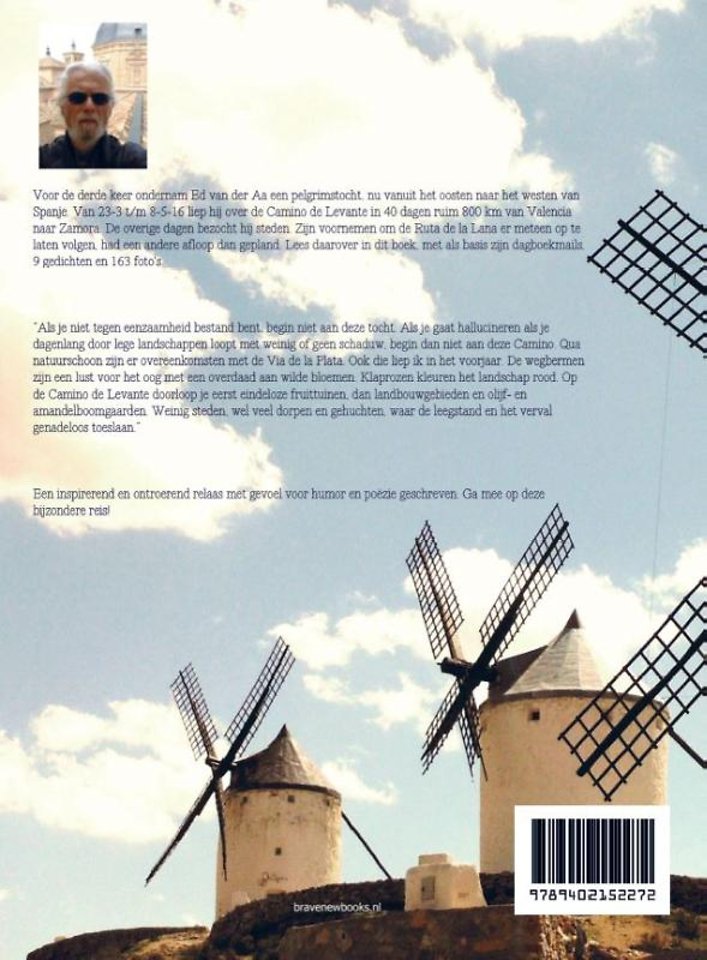 Voor de derde keer ondernam Ed van der Aa een pelgrimstocht, nu vanuit het oosten naar het westen van Spanje. Van 23-3 t/m 8-5-16 liep hij over de Camino de Levante in 40 dagen ruim 800 km van Valencia naar Zamora. De overige dagen bezocht hij steden. Zijn voornemen om de Ruta de la Lana er meteen op te laten volgen, had een andere afloop dan gepland. Lees daarover in dit boek, met als basis zijn dagboekmails, 9 gedichten en 163 foto's.