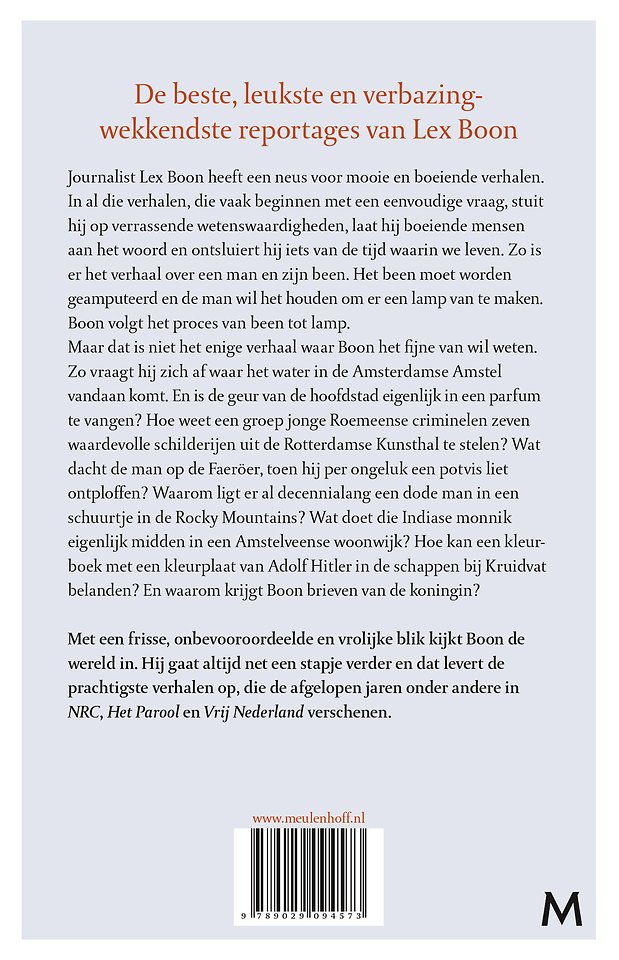Journalist Lex Boon heeft een neus voor mooie en boeiende verhalen. In al die verhalen, die vaak beginnen met een eenvoudige vraag, stuit hij op verrassende wetenswaardigheden, laat hij boeiende mensen aan het woord en ontsluiert hij iets van de tijd waarin we leven. Waar komt het water in de Amstel in Amsterdam eigenlijk vandaan? Het lijkt een simpele vraag die je kunt beantwoorden door op de kaart te kijken. Maar zo eenvoudig is het niet. Boon eindigt zijn fantastische zoektocht op een bergtop in Zwitserland. Een andere reportage speelt zich af in 236 stegen van Amsterdam, waar dingen gebeuren die het daglicht niet kunnen verdragen. En is de geur van de hoofdstad eigenlijk in een parfum te vangen?