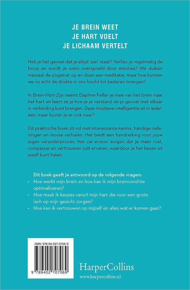 In Brein-Hart-Zijn neemt Daphne Feller je mee van het brein naar het hart en leert ze je hoe je je verstand en je gevoel met elkaar in verbinding kunt brengen. Deze intuïtieve intelligentie zit in iedereen, maar luister je er ook naar? Dit praktische boek zit vol met interessante kennis, handige oefeningen en mooie verhalen. Het biedt een handreiking voor jouw eigen veranderproces. Het zal ervoor zorgen dat je meer rust, compassie en vertrouwen zult ervaren, waardoor je het beste uit jezelf kunt halen.