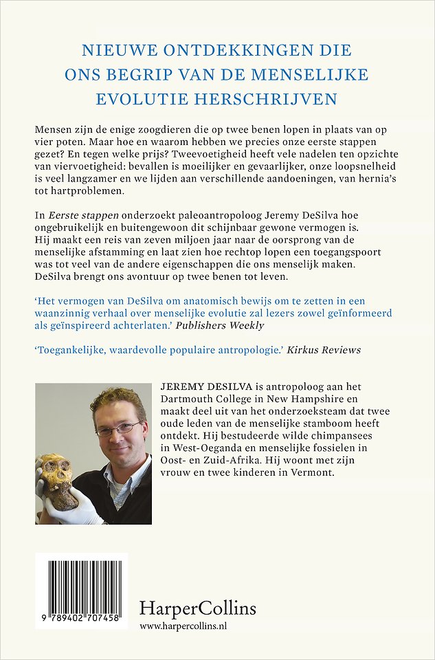 In Eerste stappen onderzoekt paleoantropoloog Jeremy DeSilva hoe ongebruikelijk en buitengewoon dit schijnbaar gewone vermogen is. Hij maakt een reis van zeven miljoen jaar naar de oorsprong van de menselijke afstamming en laat zien hoe rechtop lopen een toegangspoort was tot veel van de andere eigenschappen die ons menselijk maken. DeSilva brengt ons avontuur op twee benen tot leven.