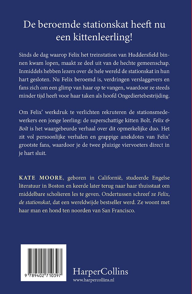 Om Felix’ werkdruk te verlichten rekruteren de stationsmedewerkers een jonge leerling: de superschattige kitten Bolt. Felix & Bolt is het waargebeurde verhaal over dit opmerkelijke duo. Het zit vol persoonlijke verhalen en grappige anekdotes van Felix’ grootste fans, waardoor je de twee pluizige viervoeters direct in je hart sluit.
