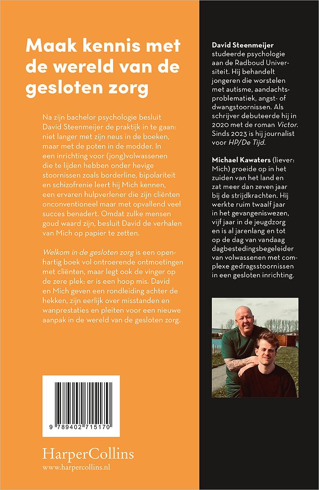Welkom in de gesloten zorg is een openhartig boek vol ontroerende ontmoetingen met cliënten, maar legt ook de vinger op de zere plek: er is een hoop mis. David en Mich geven een rondleiding achter de hekken, zijn eerlijk over misstanden en wanprestaties en pleiten voor een nieuwe aanpak in de wereld van de gesloten zorg.