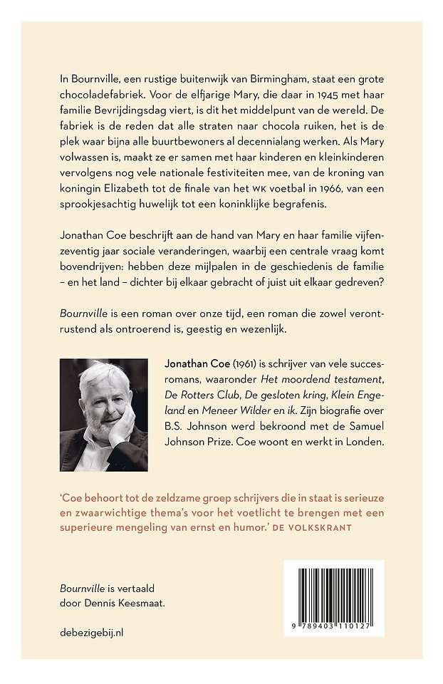Jonathan Coe beschrijft vijfenzeventig jaar vol sociale veranderingen, van de nostalgie van vlak na de oorlog tot James Bond en het coronavirus. Eén centrale vraag komt daarbij bovendrijven: hebben deze mijlpalen in de geschiedenis de familie – en het land – dichter bij elkaar gebracht of juist uit elkaar gedreven? Bournville is een roman over onze tijd, een roman die zowel verontrustend als ontroerend is, ongenadig geestig en wezenlijk.