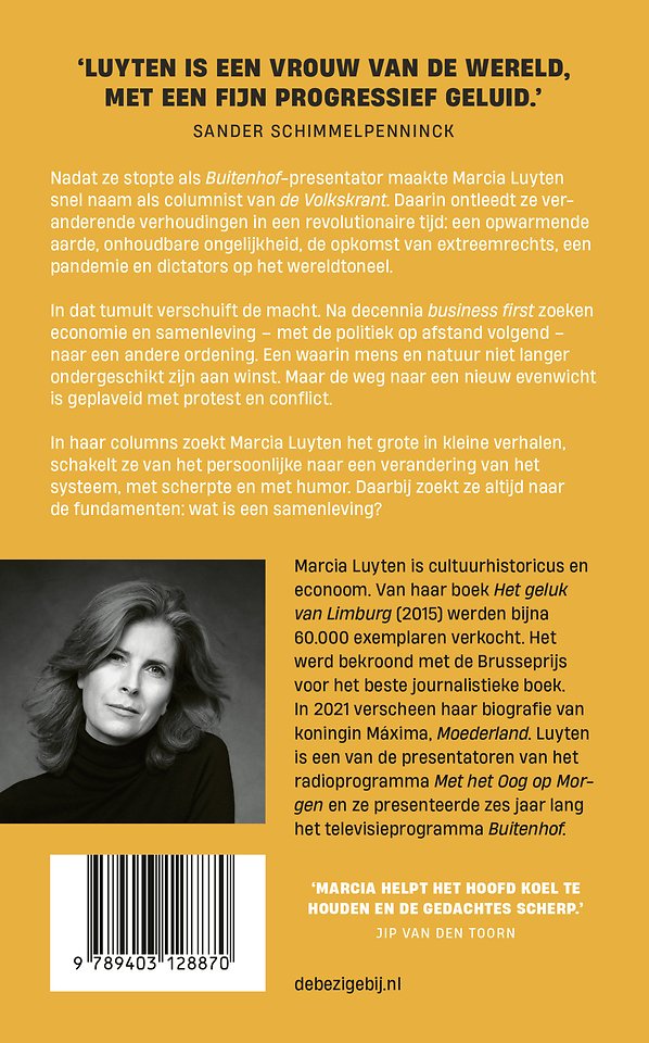 Meer over Marcia LuytenNadat ze stopte als Buitenhof-presentator maakte Marcia Luyten snel naam als columnist van de Volkskrant. Daar ontleedt ze veranderende verhoudingen in een revolutionaire tijd: een opwarmende aarde, onhoudbare ongelijkheid, de opkomst van extreemrechts, een pandemie en dictators op het wereldtoneel.