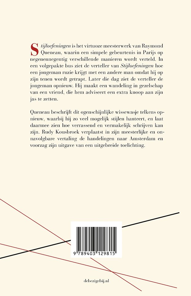Queneau beschrijft dit ogenschijnlijke wissewasje telkens opnieuw, waarbij hij zo veel mogelijk stijlen hanteert, en laat daarmee zien hoe verrassend en vermakelijk schrijven kan zijn. Rudy Kousbroek verplaatst in zijn meesterlijke en onnavolgbare vertaling de handelingen naar Amsterdam en voorzag zijn uitgave van een uitgebreide toelichting.